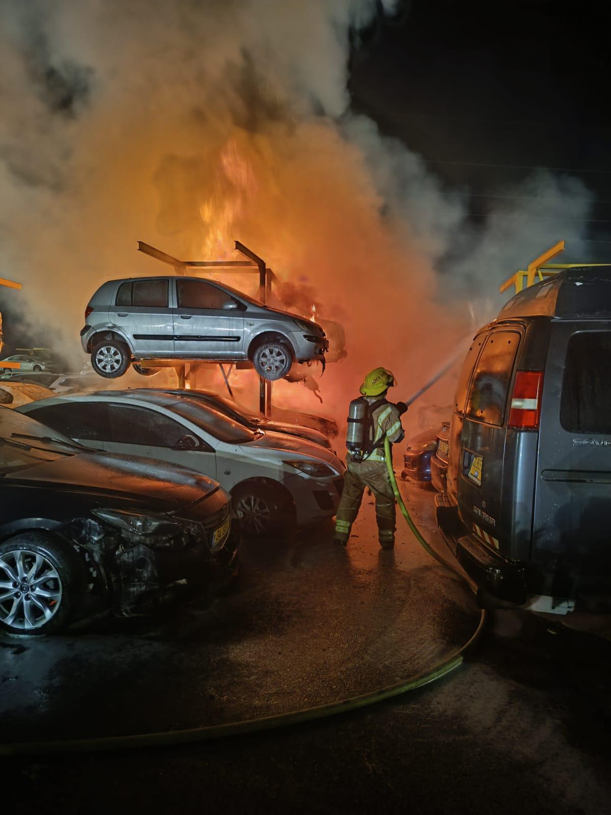 מחוז מרכז – שריפה במגרש רכבים, צוותי כבאות והצלה לישראל במקום האירוע מטפלים בשריפה של כ-20 רכבים.