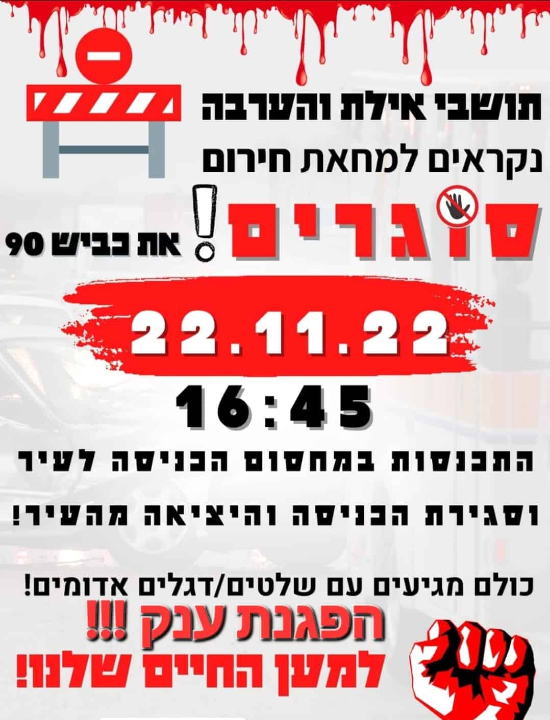 "לצערנו ממשלות ישראל לדורותיהם מפקירה את דמם של הנוסעים בכביש הדמים לאורך השנים. ביום ג' 22/11 בשעה 16.45 ייצאו תושבי אילת ויחסמו את הכניסה לעיר. במקביל ייצאו תושבי הערבה ויחסמו את הכביש בצומת עין יהב!!!