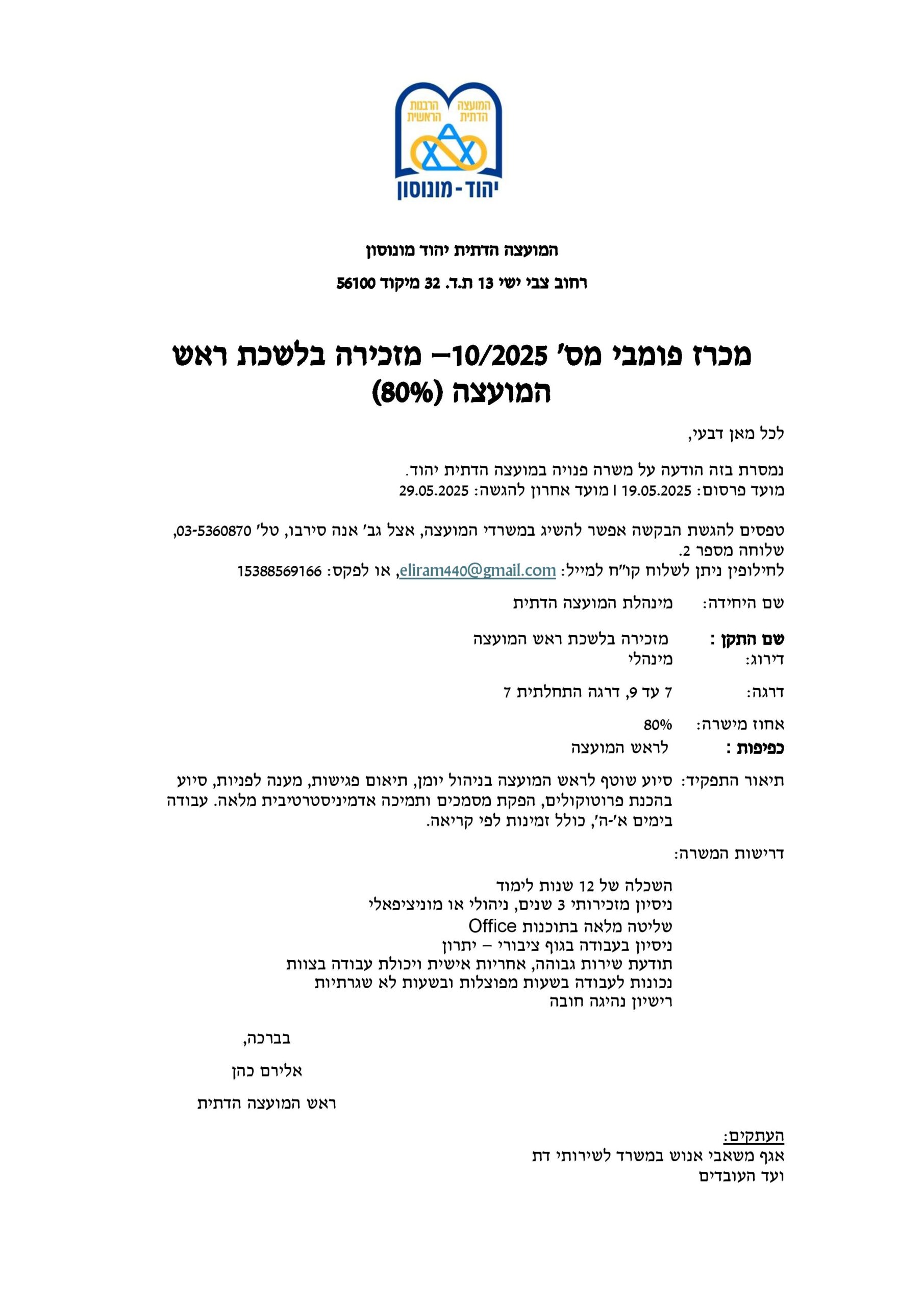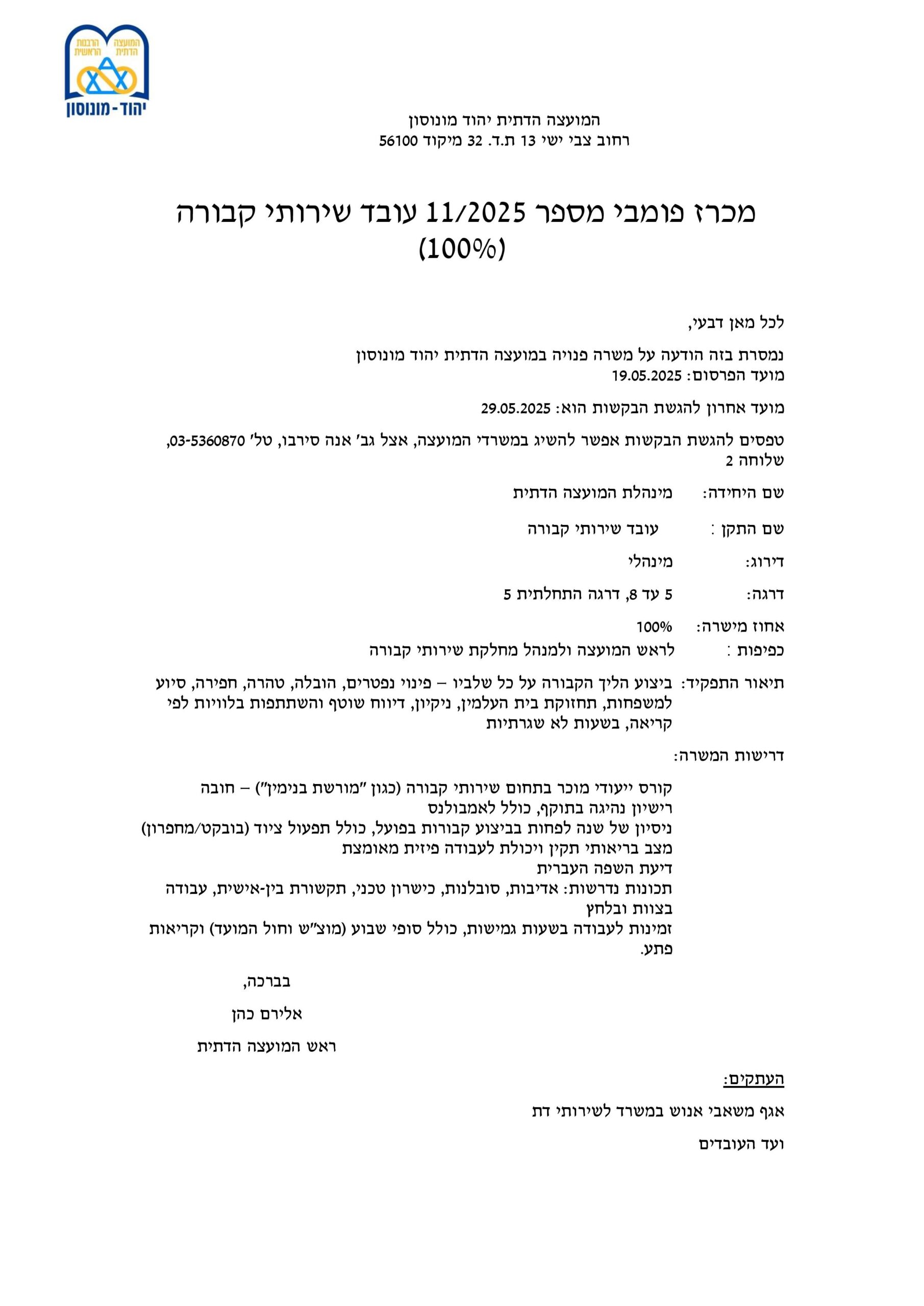 המועצה הדתית יהוד מונוסון – מכרזים חדשים