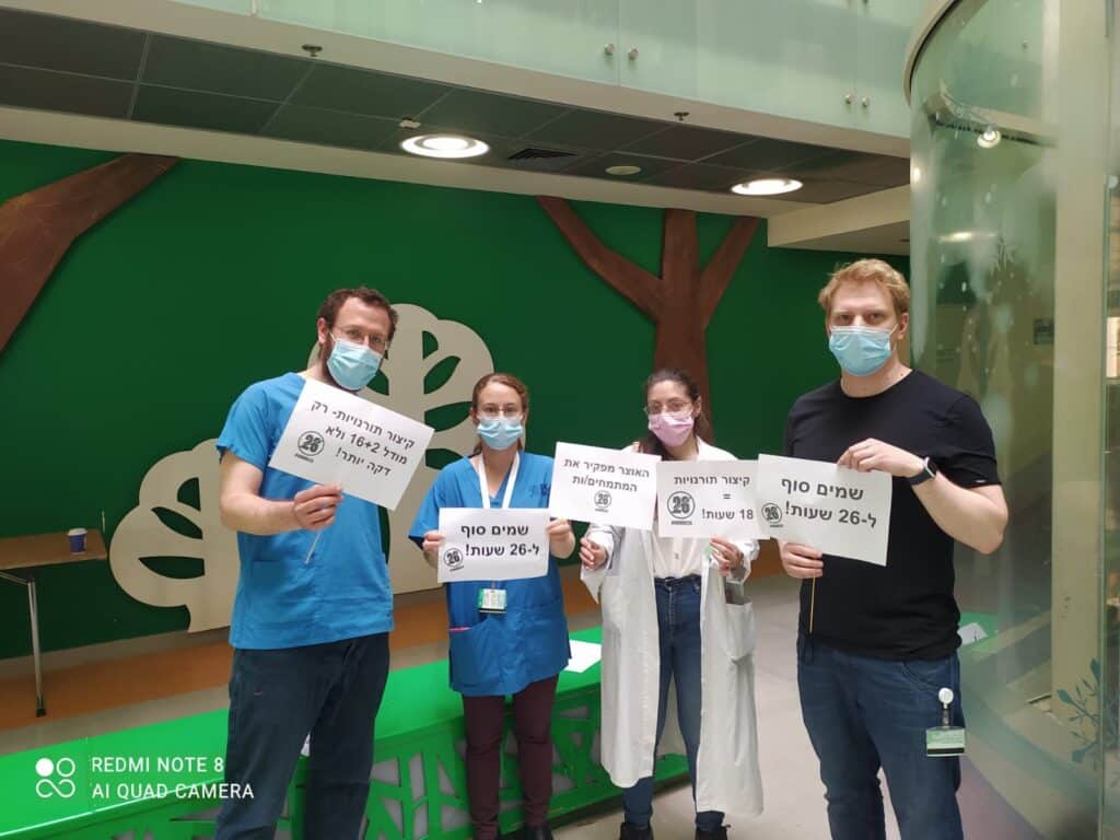עדכון תקשורת ארגון הרופאים המתמחים 'מרשם': עשרות מתמחים, סטאז'רים וסטודנטים בביה"ח וולפסון בחולון, אסותא אשדוד וקפלן ברחובות- מחו היום נגד הכוונה להוציא לפועל מתווה "קיצור תורנויות" של 20-22 שעות, הכולל "מנוחה" של המתמחים בביה"ח. בימים הקרובים צפויות פעולות מחאה בביה"ח נוספים.