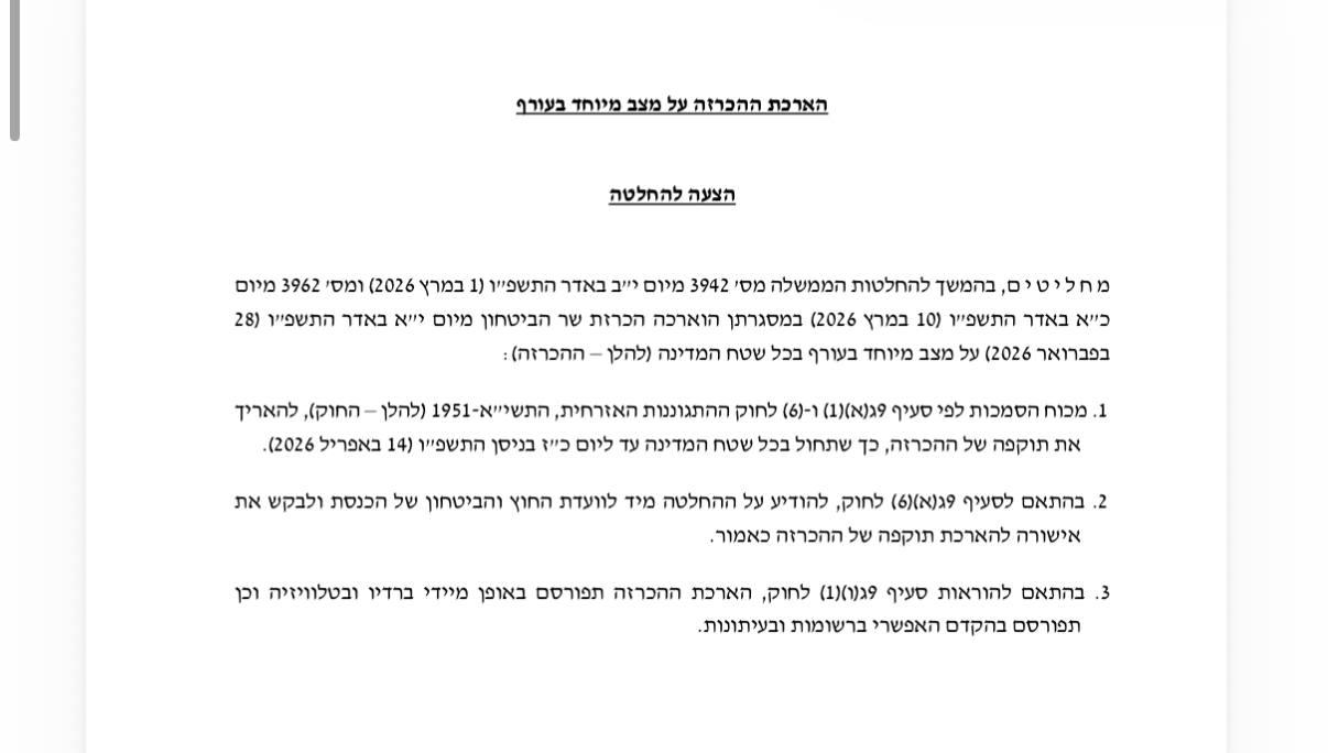 מדינת ישראל תישאר תחת מצב חירום בשבועות הקרובים: הממשלה צפויה לאשר בישיבתה הקרובה את הארכת התוקף של המצב המיוחד בעורף בכל שטח המדינה. כך עולה מהצעת החלטה רשמית שהגיעה לידי מערכת חדשות 08.