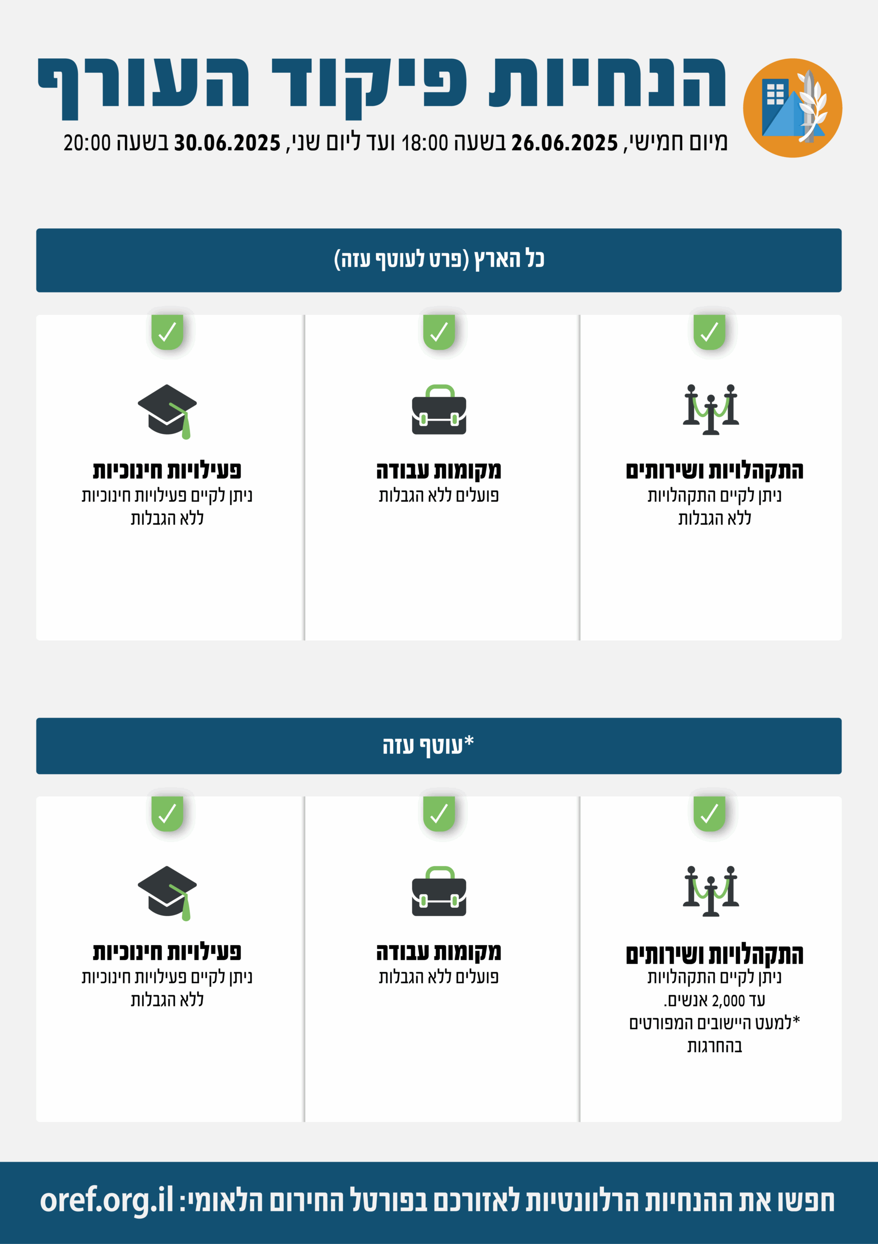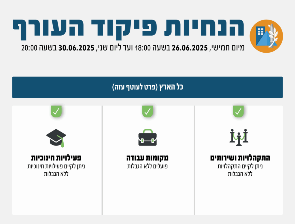 בהתאם להערכת המצב בפיקוד העורף, הוחלט על מדיניות ההתגוננות ללא שינוי | המדיניות בתוקף החל מיום חמישי, 26 ביוני 2025, בשעה 18:00 ועד ליום שני, 30 ביוני 2025, בשעה 20:00.