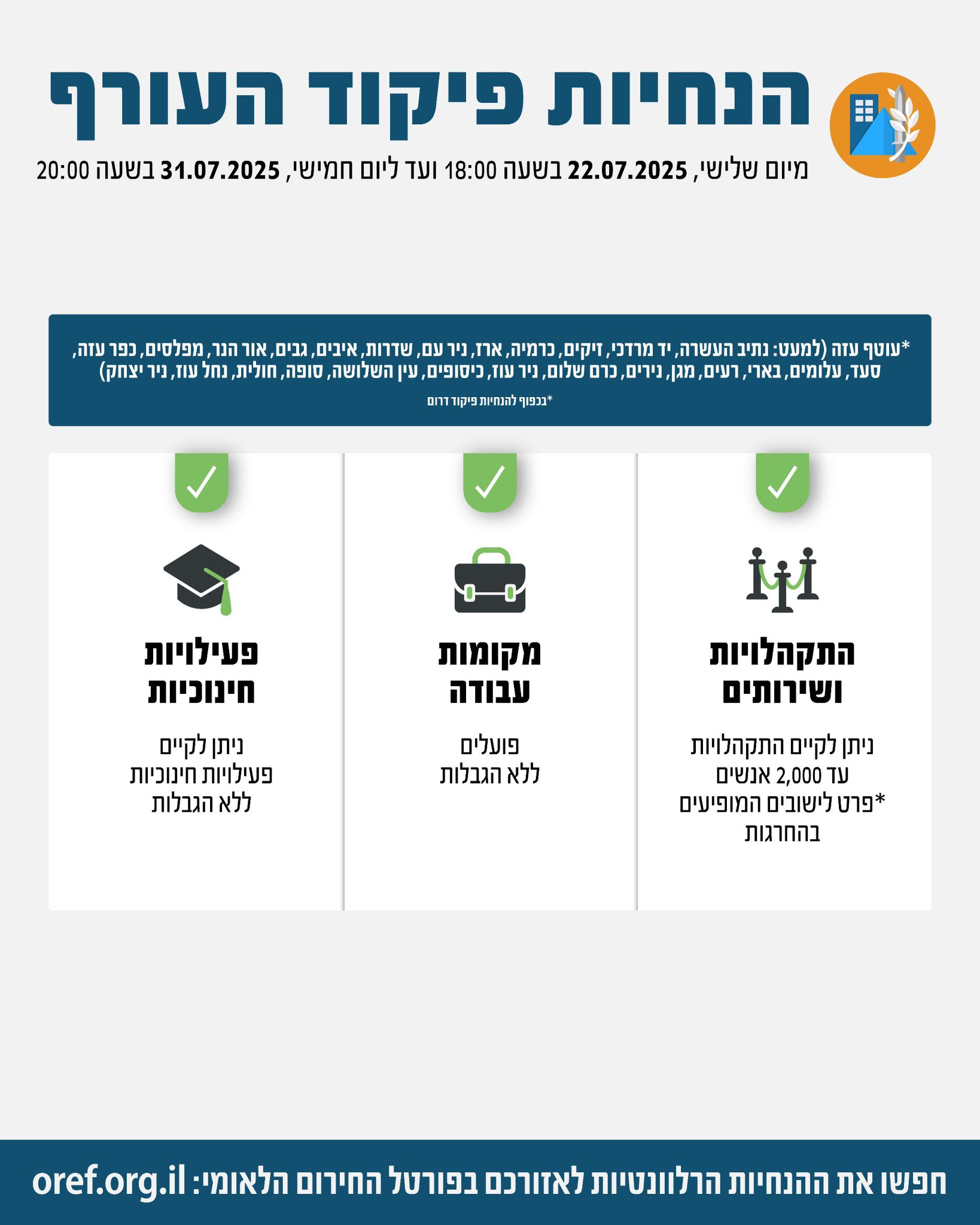 המדיניות בתוקף החל מיום שלישי, 22 ביולי 2025, בשעה 18:00 ועד ליום חמישי, 31 ביולי 2025, בשעה 20:00.
