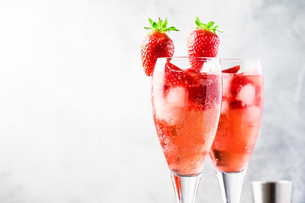 מוזגים את המרכיבים לפי הסדר לכוס שמפניה (פלוט) ומקשטים עם פרוסת תות או טוויסט לימון מעל.