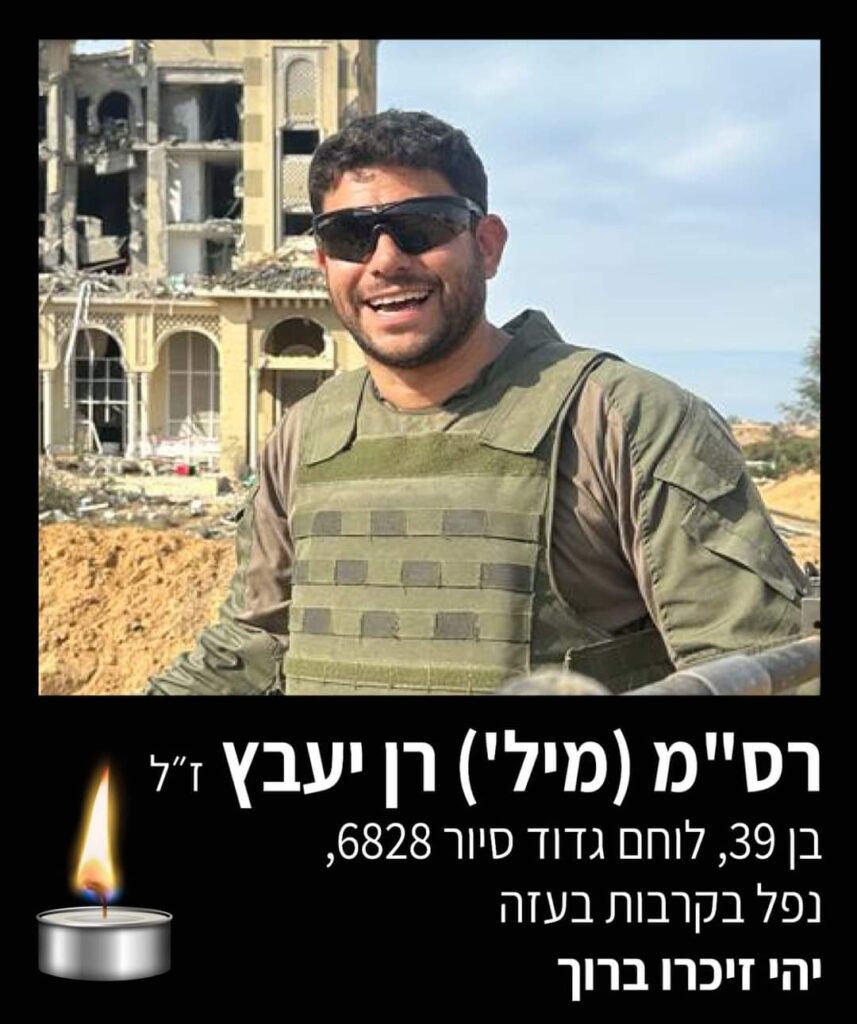 "הלב מסרב להאמין. הערב התבשרנו על נפילתו של בן העיר, רס"ם במיל' רן יעבץ. רן נשוי לתמר ואבא של איתי, נגה ואור, נפל היום בפעילות מבצעית בעוטף עזה.