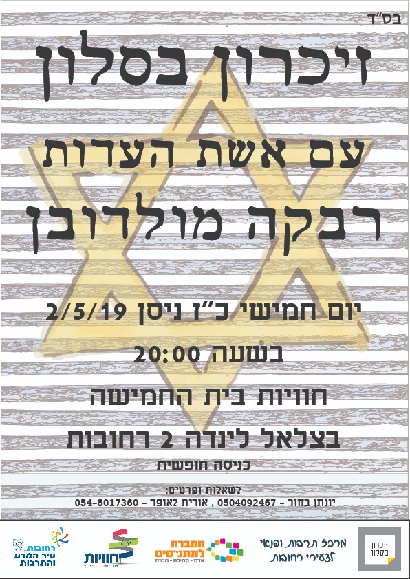 מרכז תרבות ופנאי לצעירי רחובות יקיים הערב בבית החמישה ערב זיכרון בסלון עם אשת העדות רבקה מולדובן – מדליקת משואה בטקס יום השואה.