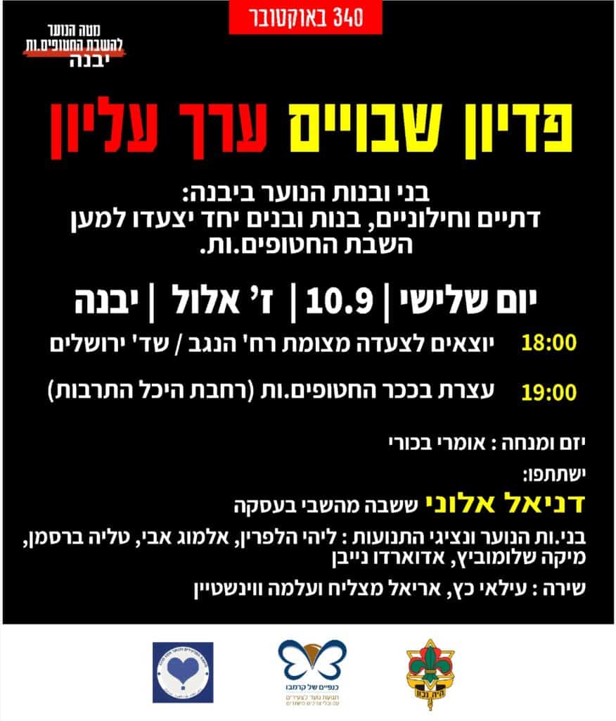 פדיון שבויים ערך עליון: בצל המצב הביטחוני בארץ, הערב (שלישי) בשעה 18:00 בערב תצא צעדה מצומת רחוב הנגב/ שדרות ירושלים ביבנה למען השבת החטופים. בשעה 19:00 תערך עצרת בכיכר החטופים ברחבת היכל התרבות.