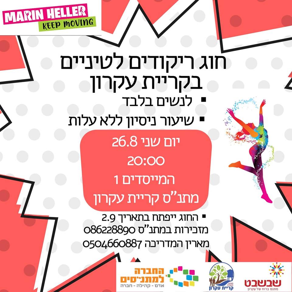 המועצה המקומית קריית עקרון יצאה בהודעה אל המגדר הנשי, להגיע לחוג ריקודים סלוניים ביום שני ( 26.8) בשעה 20:00 בערב , ברחוב המייסדים 1.