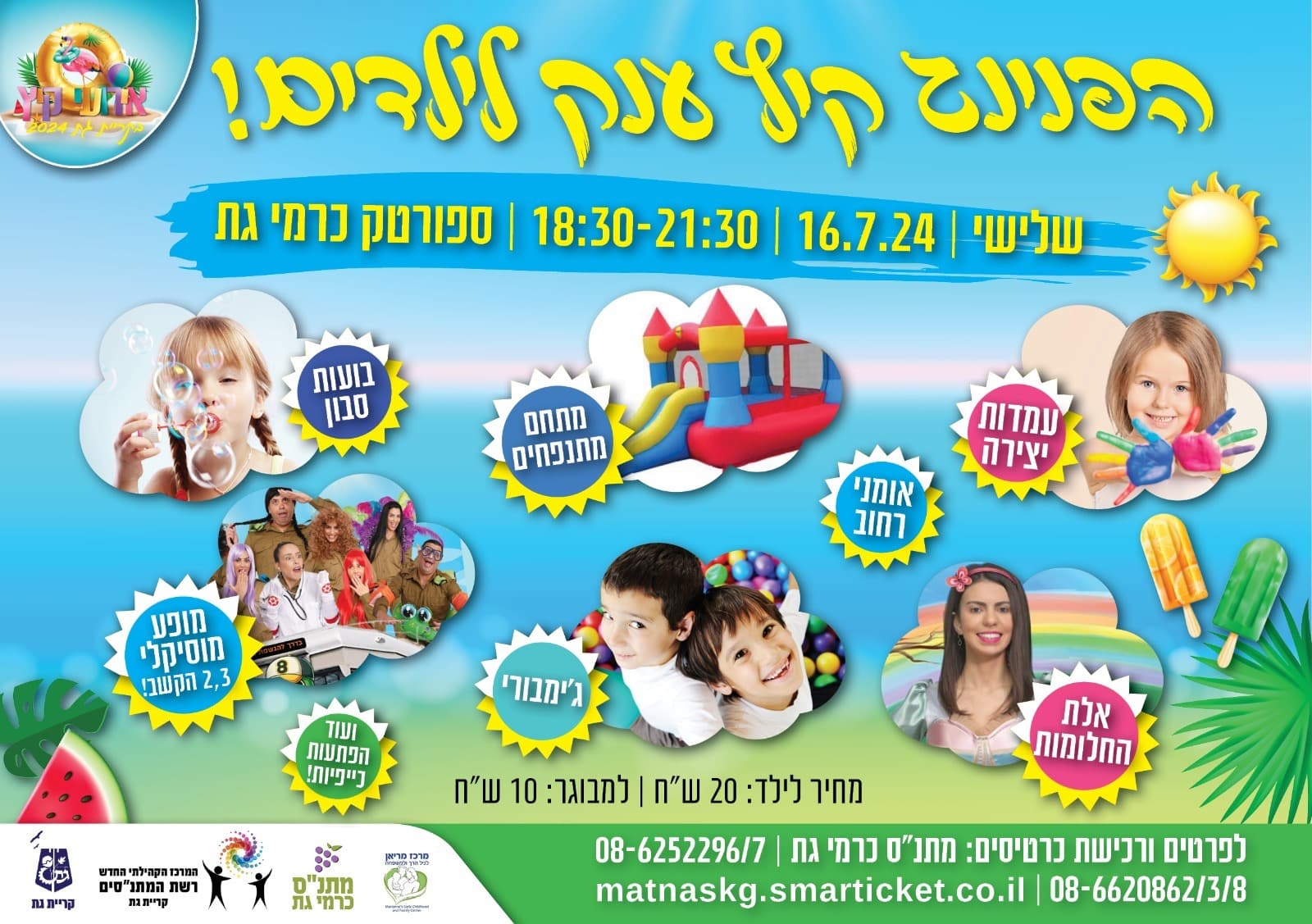 רשת המתנ"סים ומרכז מריאן מזמינים את ילדות וילדי קריית גת להפנינג הילדים הגדול בספורטק קריית גת, מחר (שלישי), 16.7.24 החל מהשעה 18:30.