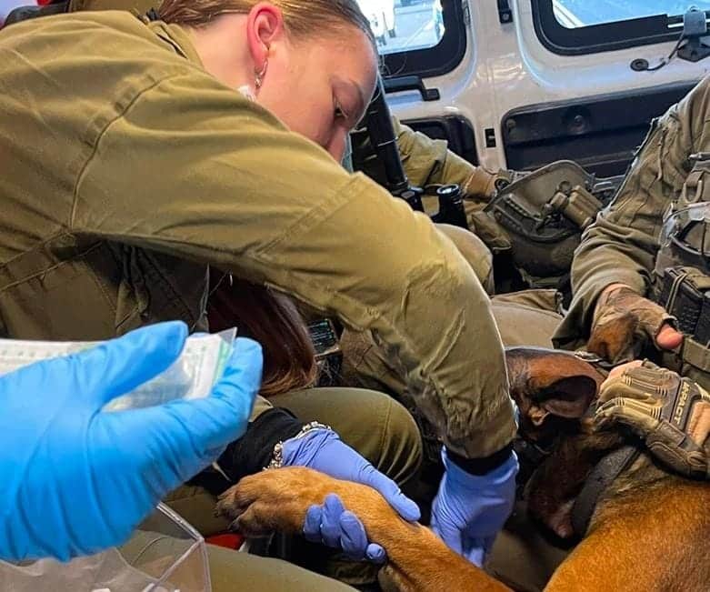 בתמונה: אליסה מטפלת בכלב מיחידת עוקץ שנפצע בפעילות מבצעית בעזה.