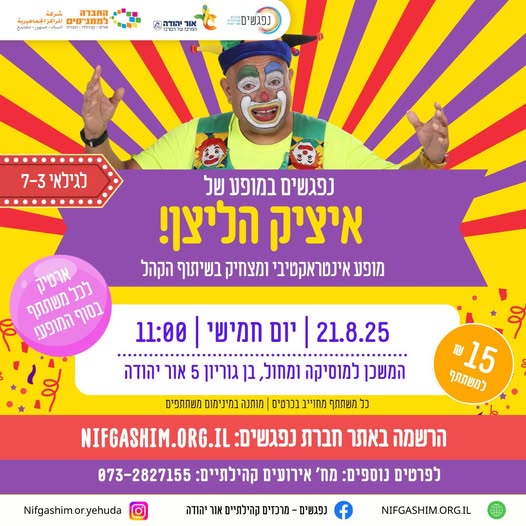 אירוע מיוחד לילדים יתקיים ביום חמישי הקרוב, ה-21 באוגוסט 2025, באור יהודה: מופע אינטראקטיבי ומצחיק של "איציק הליצן" המיועד לגילאי 3-7. העלות: 15 שקילם