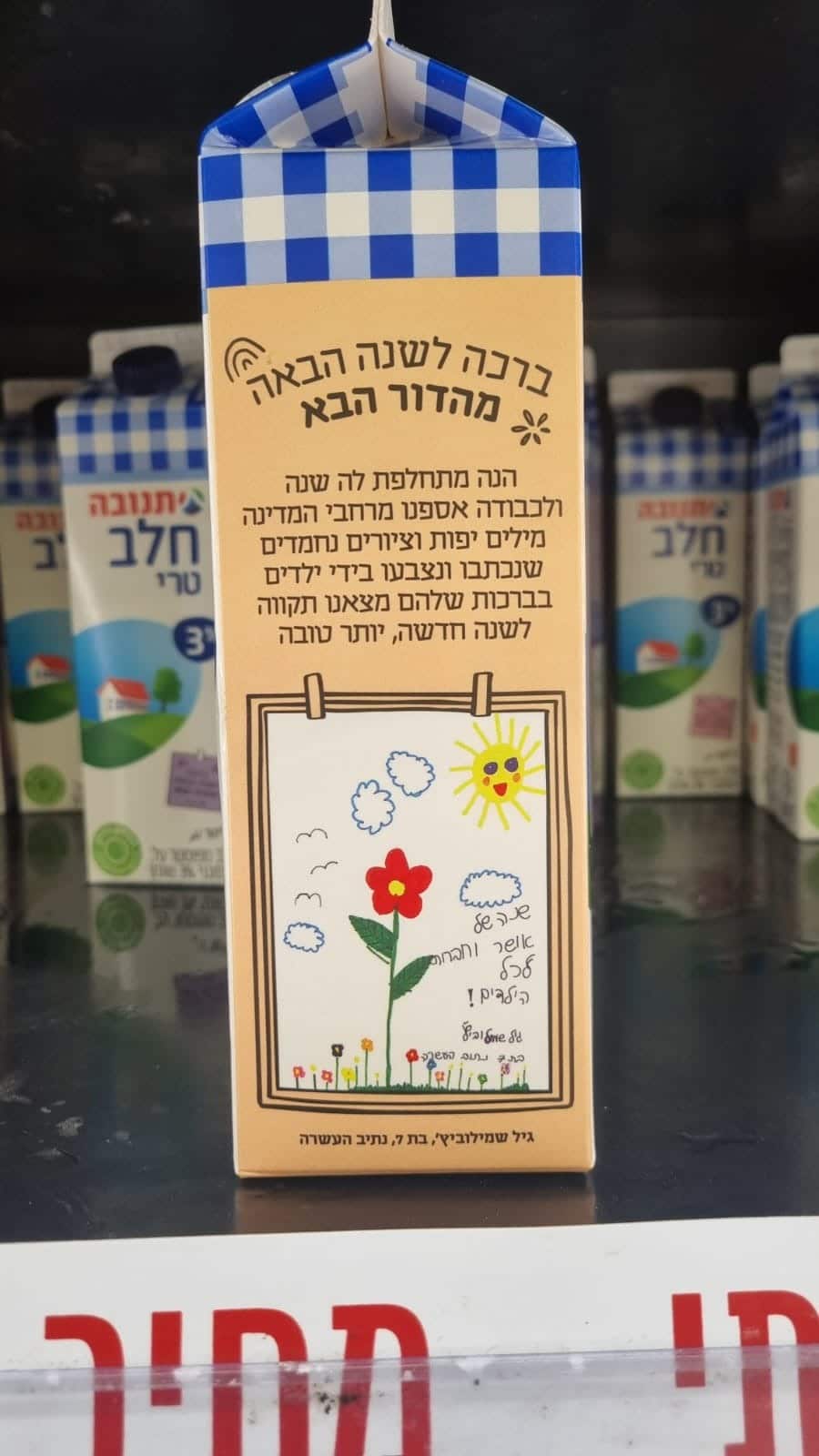 הציור של גיל, שהיא ומשפחתה מפונים מביתם ומתגוררים כעת בכוכב מיכאל, מופיע בימים אלה על קרטון חלב תנובה, במסגרת פרויקט ילדים מציירים תקווה לקראת השנה החדשה.