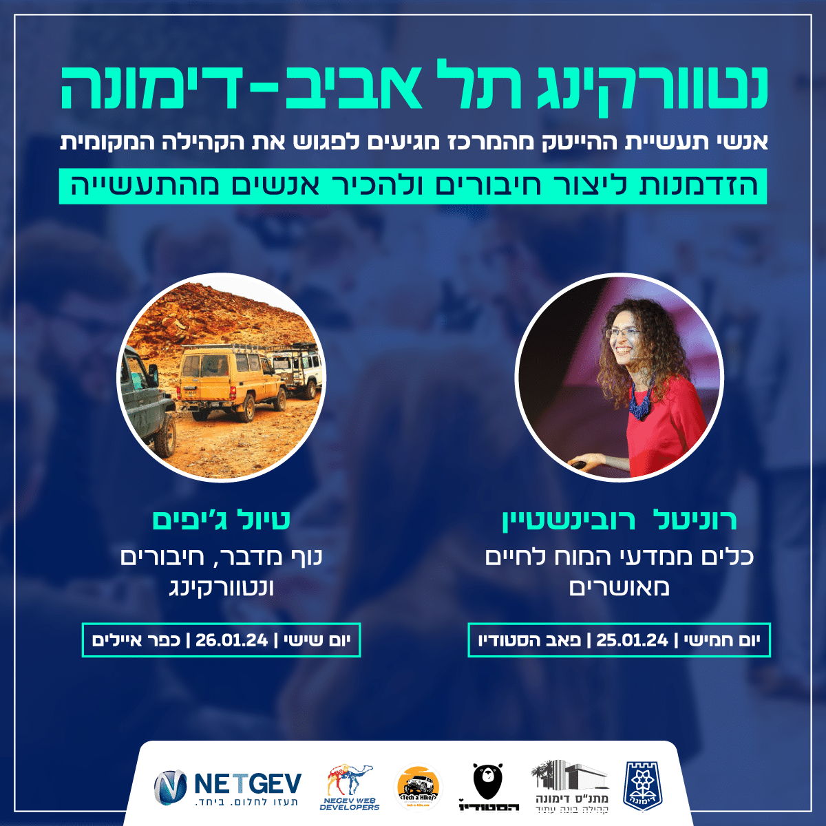 במסגרת פעילות הנטגב, זוכים חברי הקהילה לאירועים משותפים שונים, אחד מהם קורה ביומיים הקרובים- יום חמישי ושישי, 25-26.1.24 אירוע מיוחד שמעניק הצצה בלעדית לעולם החדשנות גם למי שאינו עוסק בתחום ההייטק.