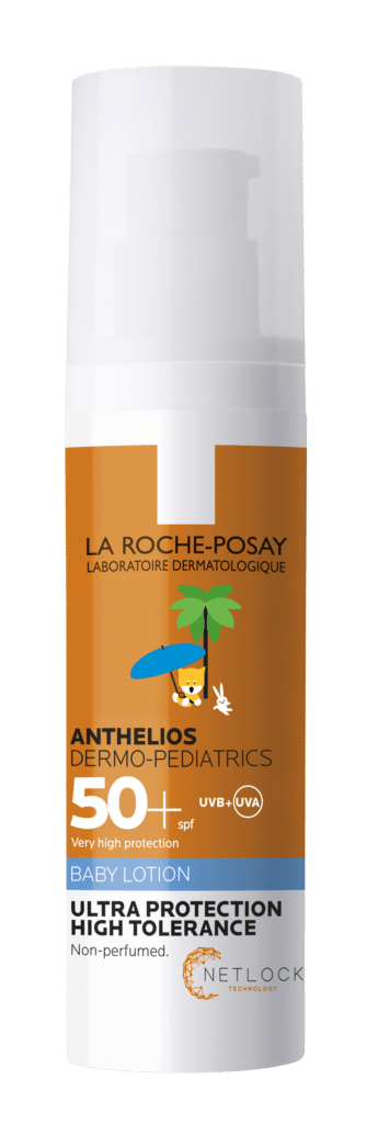 התחליב בעל הגנה הגבוהה ביותר ורחבת טווח (UVA&UVB) מפני נזקי קרינת השמש SPF50+, ללא בושם, מתאים לעור התינוק, היפוארלרגני, אינו משאיר סימנים לבנים, נבדק דרמטולוגית.