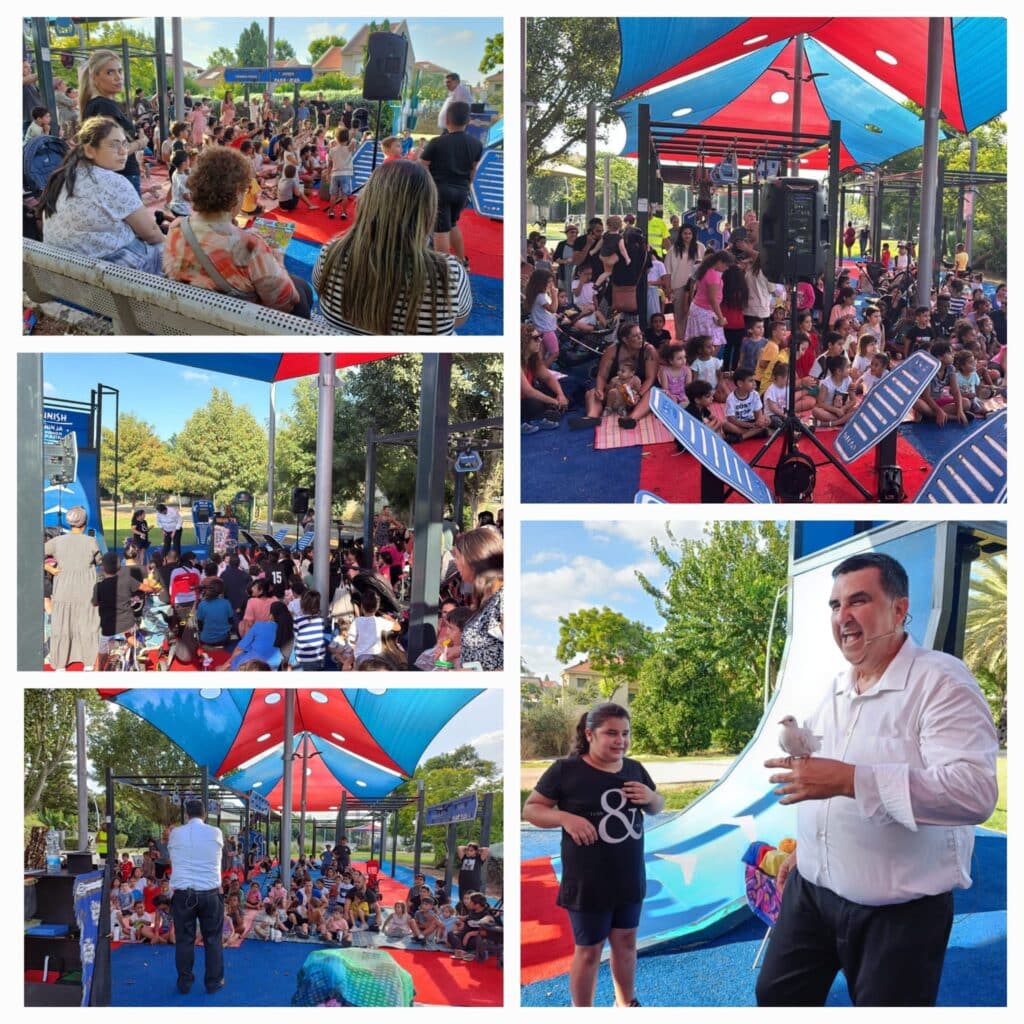 יום שני 21.08.23 בשעה 17:15 בגן זוגות צעירים (רחוב הרצל 26) מתחמי שחקו מעץ ובועות סבון.