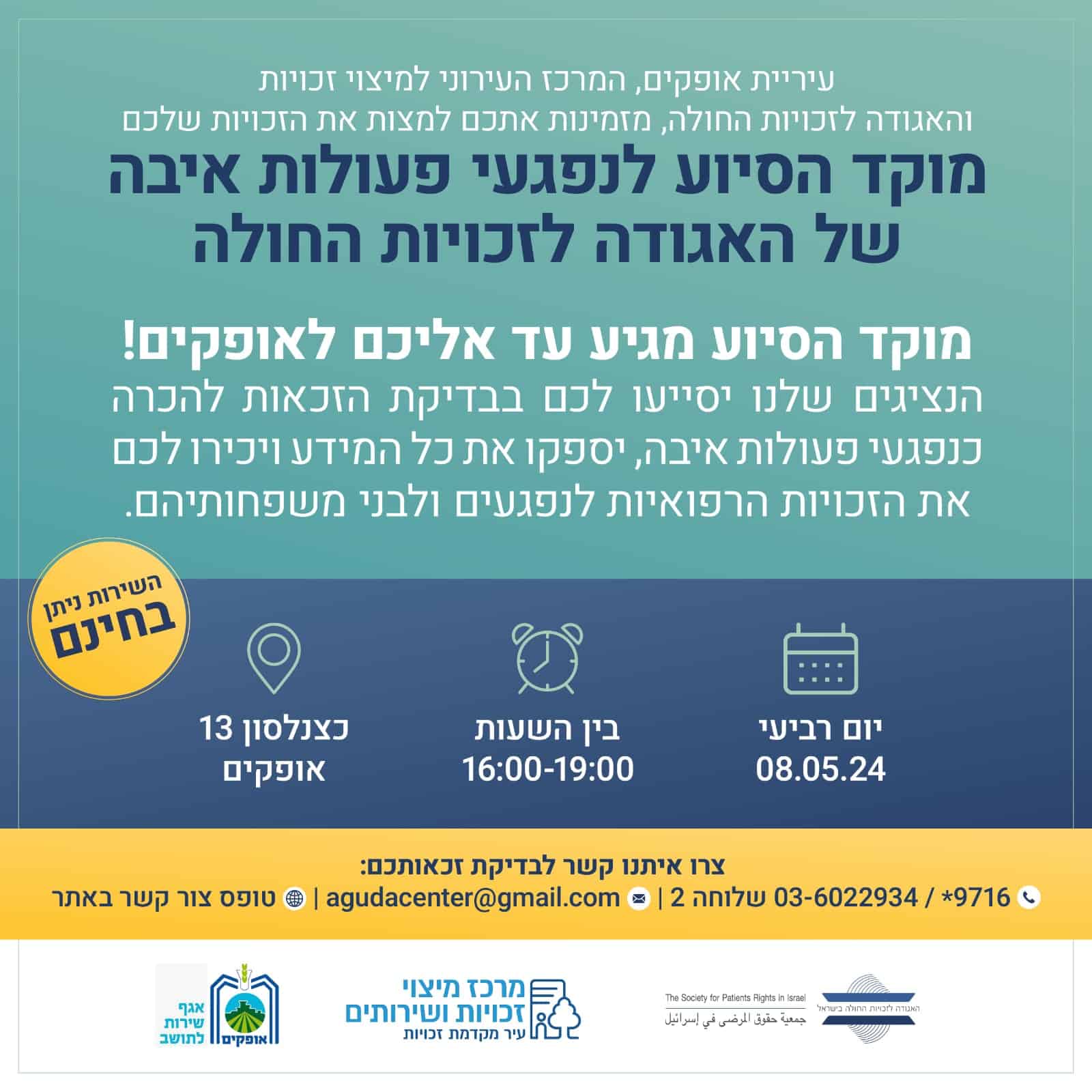 לאור הביקוש הרב וההתעניינות הרבה של תושבי אופקים בזכויות שנוגעות לפעולות איבה נפתח יום נוסף של קבלת קהל לנציגי האגודה לזכויות החולה.