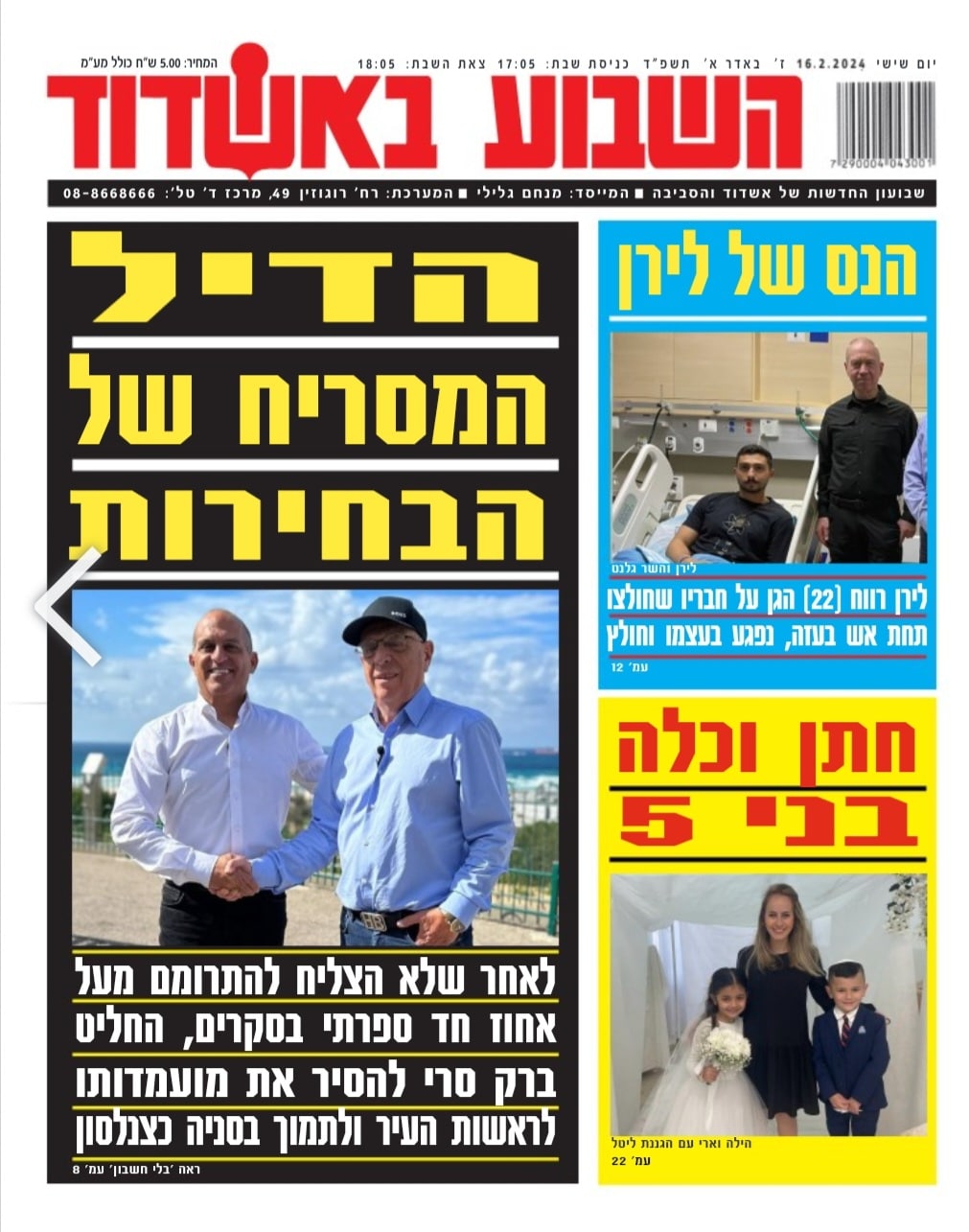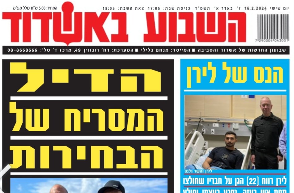 השבוע בגיליון: הדיל המסריח של הבחירות בכיכובם של סניה כצנלסון וברק סרי, הנס,של לירן רווח שהגן על חבריו שחולצו תחת אש בעזה, נפגע בעצמו וחולץ וחתן וכלה בני 5 לצד סיפורים נוספים וראשוניים, ספורט ורכילות.