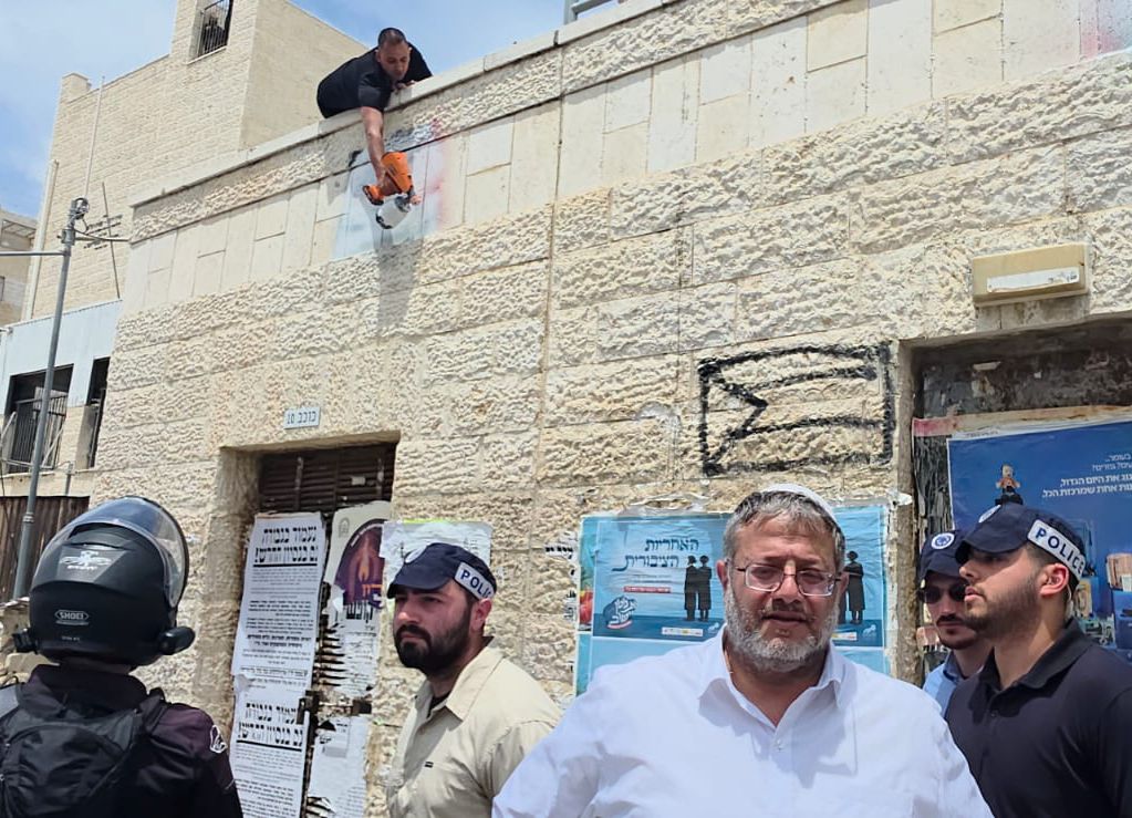 עובדי עיריה בליווי כוחות של משטרה בבית שמש מסירים גרפיטי של דגלי אש"ף תחת עיניו של השר איתמר בן גביר