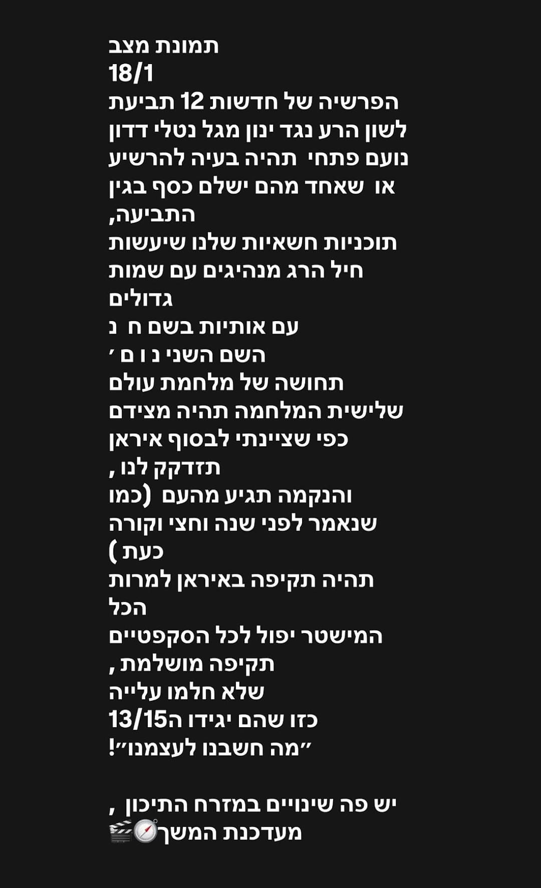 כהן מסכמת את דבריה בנימה אופטימית עבור ישראל: "יש פה שינויים במזרח התיכון, מעדכנת בהמשך". נמשיך לעקוב.