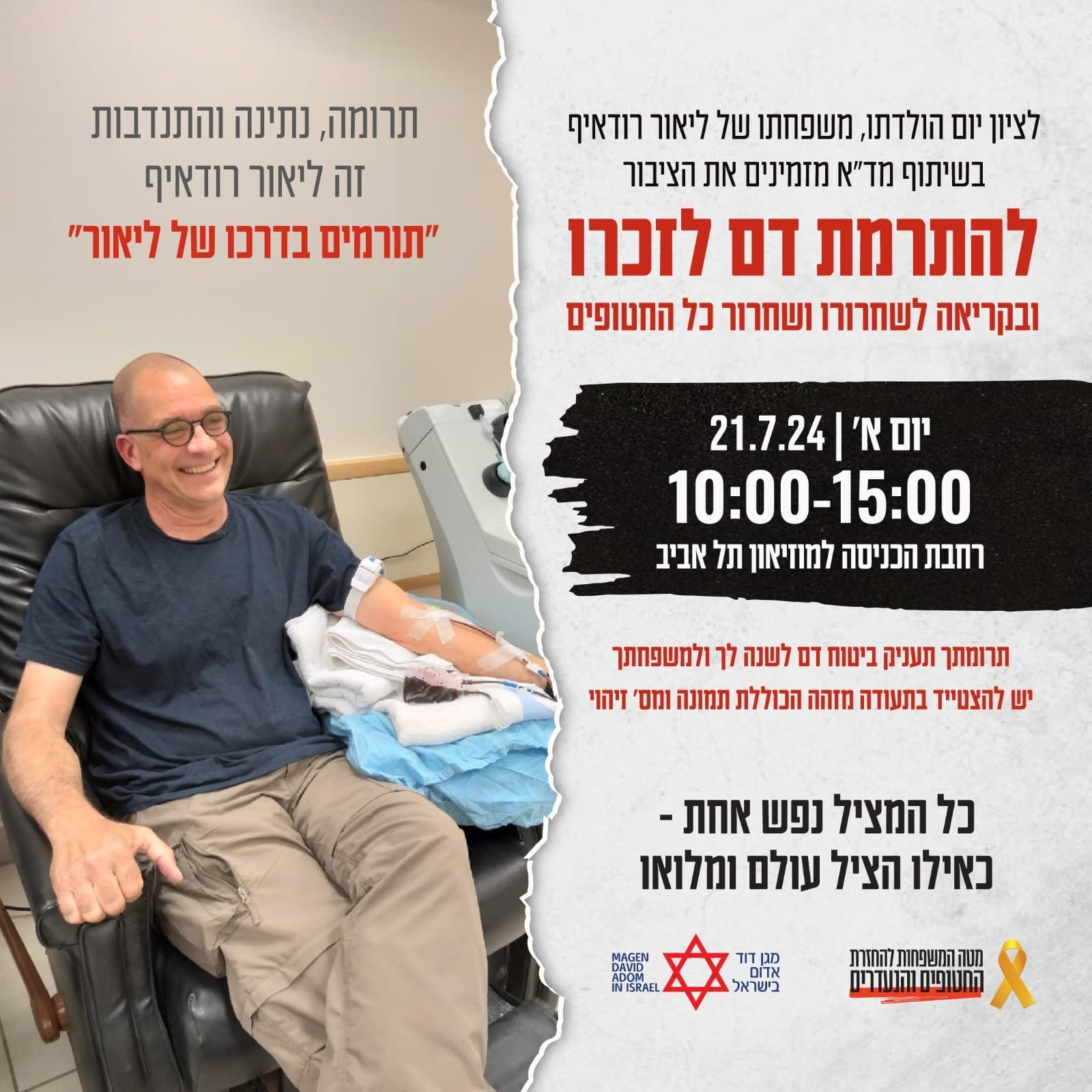לציון יום הולדתו של מתנדב מד"א ליאור רודאיף שנפל ב-7.10, יתקיים ביום א' הקרוב (21.7) מבצע התרמת דם בשיתוף משפחתו, שירותי הדם של מד"א ומטה המשפחות להחזרת החטופים והנעדרים.