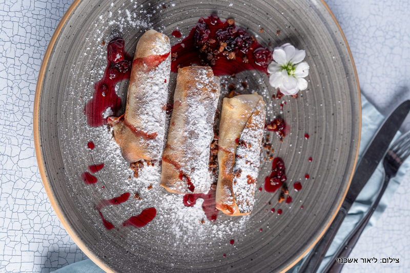 מתוק לסיום: בליני פטיסייר קלאסי (56 ₪) או עוגת גלידה שמנת עם פירות יער (56 ₪).