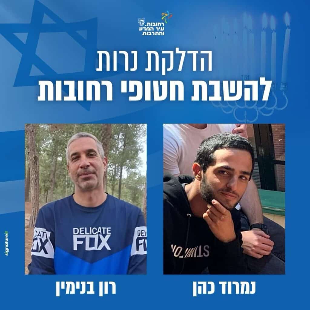 היום נדליק שני נרות חנוכה עם תפילה, תקווה ואמונה שנמרוד כהן ורון בנימין, שני החטופים תושבי רחובות, יחזרו למשפחות שלהם במהרה! וכמובן, תפילה להשבת כלל החטופות והחטופים שלנו במהרה, כי באנו חושך לגרש.