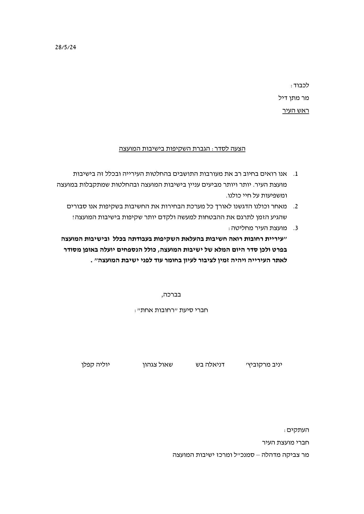 יניב מרקוביץ' יו"ר סיעת "רחובות אחת" יחד עם שלושת חבריו לסיעה: דניאלה בש, שאול צגהון ויוליה קפלן הגישו הצעה לסדר לדיון בישיבת מועצת העיר.