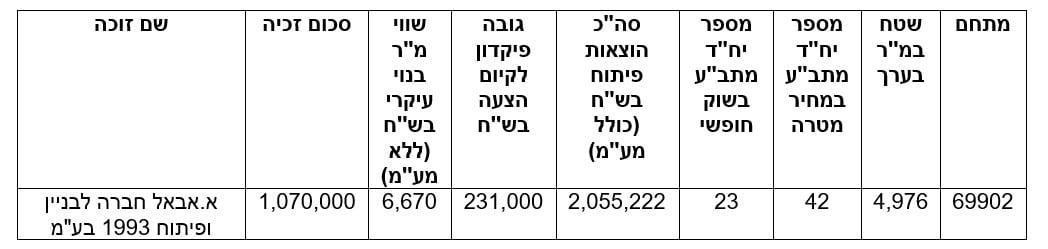 הזוכה -א. אבאל חברה לבניין ופיתוח -תשלם לרשות מקרקעי ישראל על הקרקע כ-1,070,000 ש"ח (לא כולל מע"מ והוצאות פיתוח)