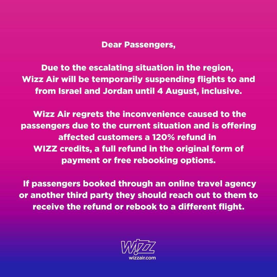 בשל המצב המתוח באזור, חברת Wizz Air תשעה זמנית את הטיסות אל ומישראל וירדן עד ל-4 באוגוסט, כולל.