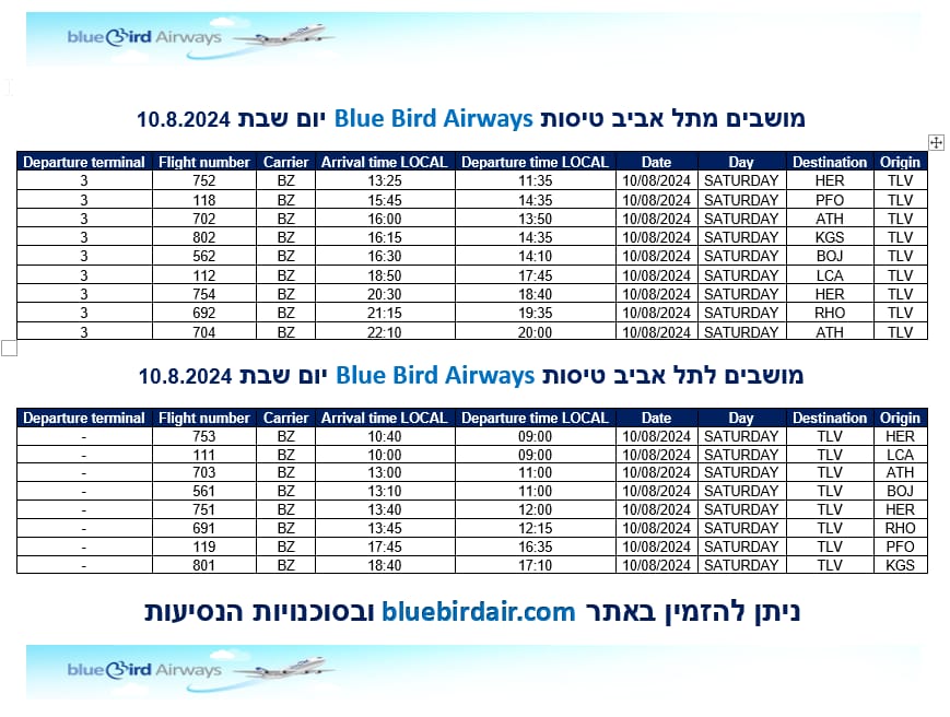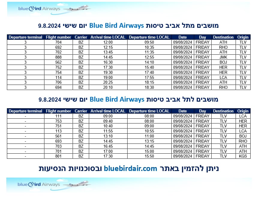להלן לוח הזמנים לטיסות עם זמינות מושבים מ/ אל תל אביב של חברת התעופה היוונית Blue Bird Airways לימים שישי 9.8 ושבת 10.8 ניתן לרכוש כרטיסים 24/7 באתר חברת bluebirdair.com ובסוכנויות הנסיעות
