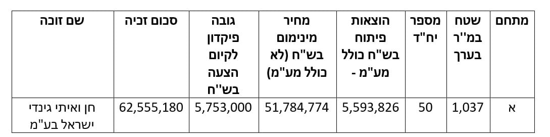 למכרז הוגשה הצעה אחת בלבד של חברת חן ואיתי גינדי בע"מ אשר ישלמו 62,555,180 ₪ לרשות מקרקעי ישראל, לא כולל מע"מ ופיתוח.