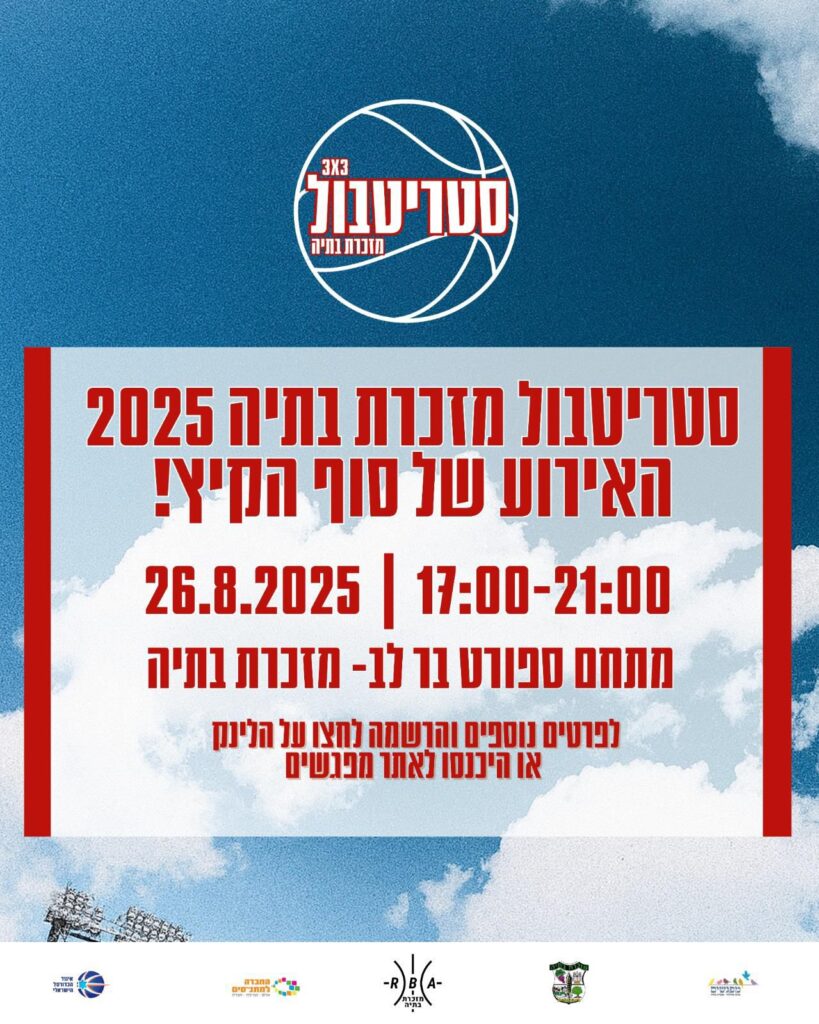 הקיץ מגיע לסיומו, ובמזכרת בתיה יודעים לחגוג אותו בדרך הכי ספורטיבית ושמחה שיש: טורניר סטריטבול 3X3 חגיגי לכל הגילאים. ביום שלישי, 26 באוגוסט, החל מהשעה 17:00, יתמלאו מגרשי הכדורסל בשכונת בר לב בשחקנים, אוהדים, משפחות ואוהבי כדורסל מכל הגילים – באירוע שמשלב תחרותיות, קהילה וכיף גדול.
