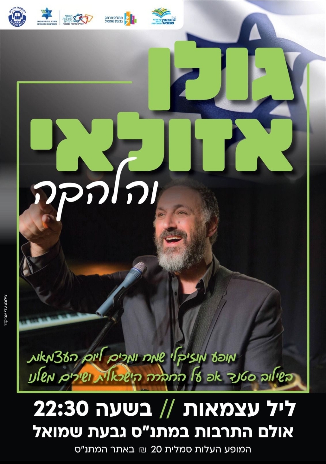 בשעה 22:30 יעלה גולן אזולאי עם להקתו על בימת אולם התרבות במתנ"ס. המופע, שמשלב מוזיקה עם סטנד-אפ ושירים על החברה הישראלית, יתקיים בעלות סמלית של 20 ש"ח (כרטיסים באתר המתנ"ס).