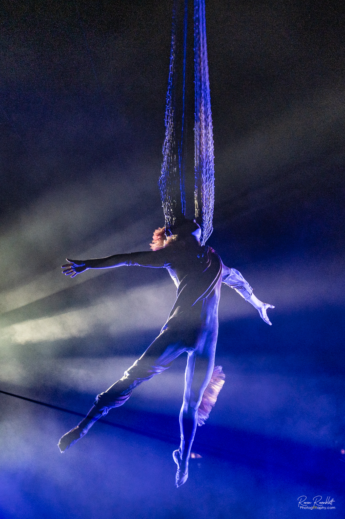 הקברט הלבן – שילוב מוזיקה חיה, אקרובטיקה אווירית ותאורה מסונכרנת.