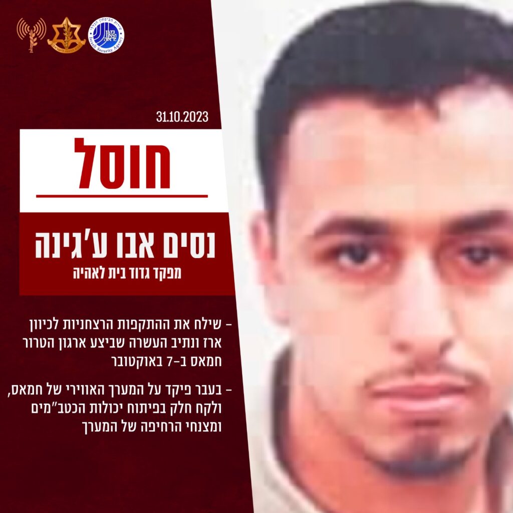 מטוסי קרב בהכוונת מידע מודיעיני של אמ"ן ושב״כ, חיסלו אמש את מפקד גדוד בית לאהיה בחטיבה הצפונית של חמאס, נסים אבו עג'ינה, אשר שילח את המתקפות הרצחניות של חמאס ב-7 באוקטובר לקיבוץ ארז ולמושב נתיב העשרה. בעבר, הוא פיקד על המערך האווירי של חמאס, ולקח חלק בפיתוח יכולות הכטב״מים ומצנחי הרחיפה של ארגון הטרור.