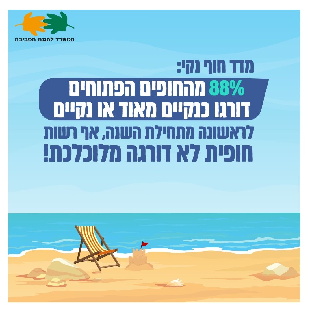 המשרד להגנת הסביבה מפרסם את נתוני מדד חוף נקי של חודש יוני, שמהם עולה כי 88% מחופים הפתוחים שנמדדו דורגו כ"נקיים" עד "נקיים מאוד". מדובר בשיפור של 10% לעומת חודש מאי, אך ירידה ביחס למדד בשנה שעברה באותה תקופה שהיה 93%.