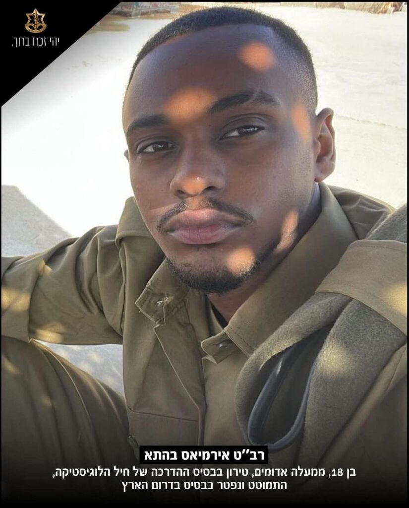 רב״ט אירמיאס בהתא (Ermias Bahata), בן 18, ממעלה אדומים, טירון בבסיס ההדרכה של חיל הלוגיסטיקה, התמוטט ונפטר בבסיס בדרום הארץ, מוקדם יותר היום (ה').