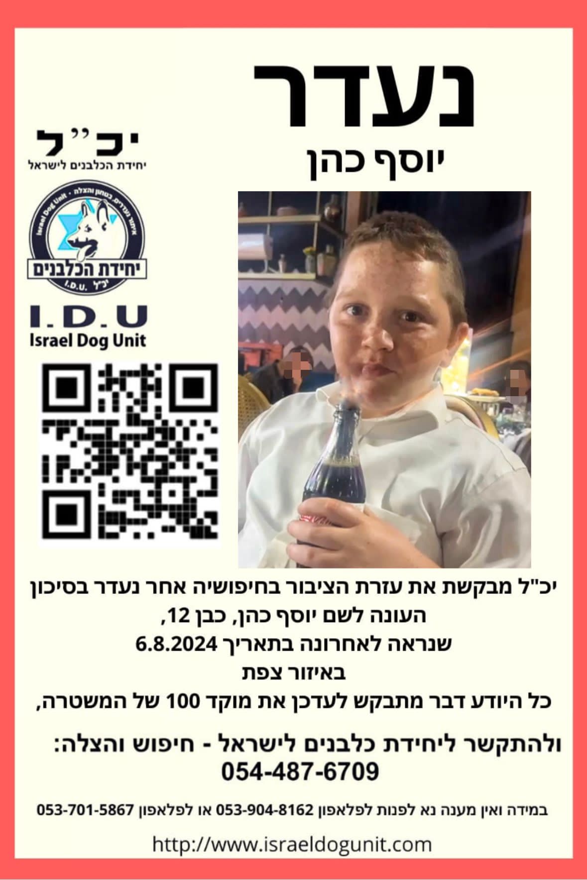 מתנדבי יכ"ל מרחב גליל בפיקודו של שמואל סגל, הוקפצו, ומצויים בשעות האחרונות בחיפושים נרחבים בגזרת צפת, אחר הנעדר יוסף כהן, כבן 12, שנעלמו עקבותיו בתאריך 06.08.2024 מאזור צפת.