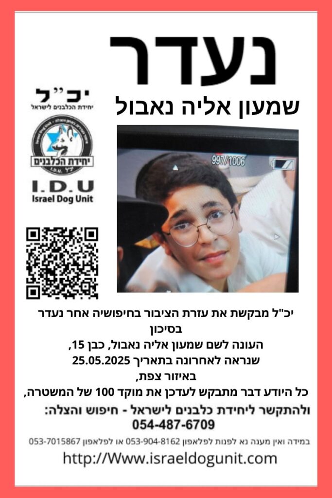 יכ"ל מבקשת את עזרת הציבור בחיפושיה אחר נעדר בסיכון, בשם שמעון אליה נאבול, כבן 15, שנראה לאחרונה בתאריך 25.05.2025 באזור צפת.