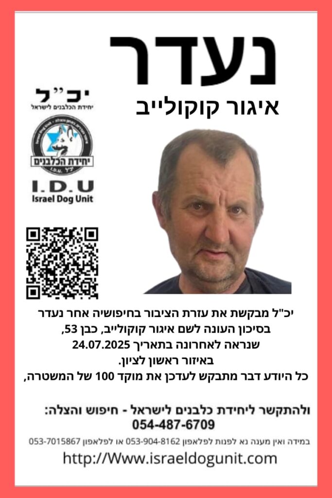 יכ"ל מבקשת את עזרת הציבור בחיפושיה אחר נעדר, בשם איגור קוקולייב, כבן 53, שנראה לאחרונה בתאריך 24.07.2025 באזור ראשון לציון.