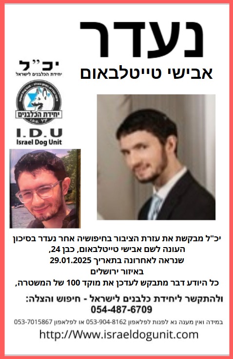 יכ"ל מבקשת את עזרת הציבור בחיפושיה אחר נעדר בסיכון, בשם אבישי טייטלבאום, כבן 24, שנראה לאחרונה בתאריך 29.01.2025 באזור ירושלים.