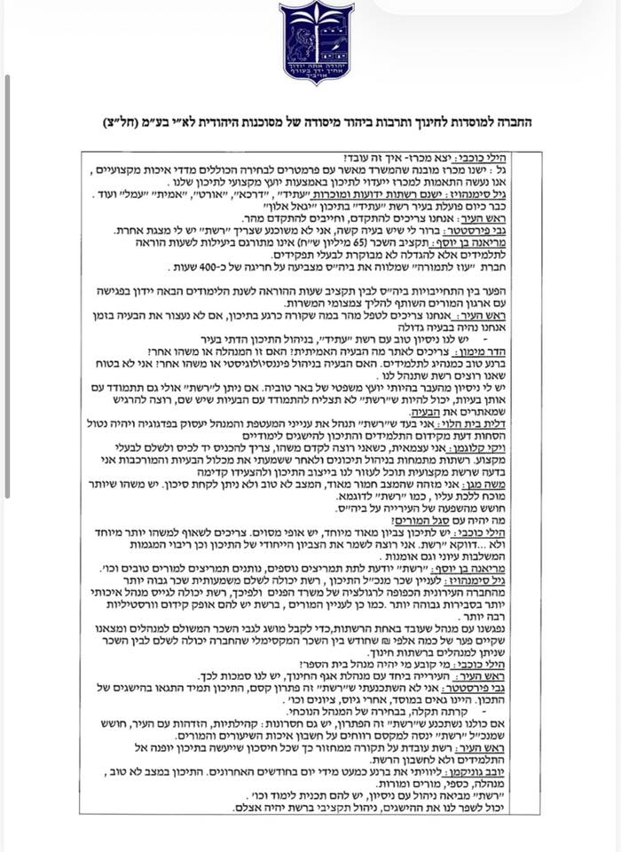 מנהלת אגף החינוך, מריאנה בן יוסף, הציגה בפני חברי הדירקטוריון נתונים קשים: "המקיף נמצא במשבר. משבר ניהולי, פדגוגי וגם כספי… יש חריגה של כ-5 מיליון ש"ח בשעות המאושרות על ידי משרד החינוך… צוות המורים נמצא בחוסר אמון במערכת. מנהל התיכון כבר נתן הודעה על סיום תפקידו."