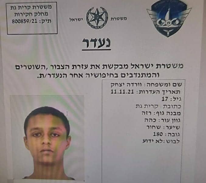 משטרת ישראל ועיריית קרית גת מבקשים סיוע באיתור הנער וורדה יצחק בן ה-17. וורדה נעלם מאתמול ונכון לשעה זו החיפושים מתרחבים. תיאורו: מבנה רזה, גוון עור – כהה, שיער שחור, גובה -1.80. אם יש בידכם פרטים או מידע אנא פנו למשטרת קרית גת מוקד 100 או למוקד 106.