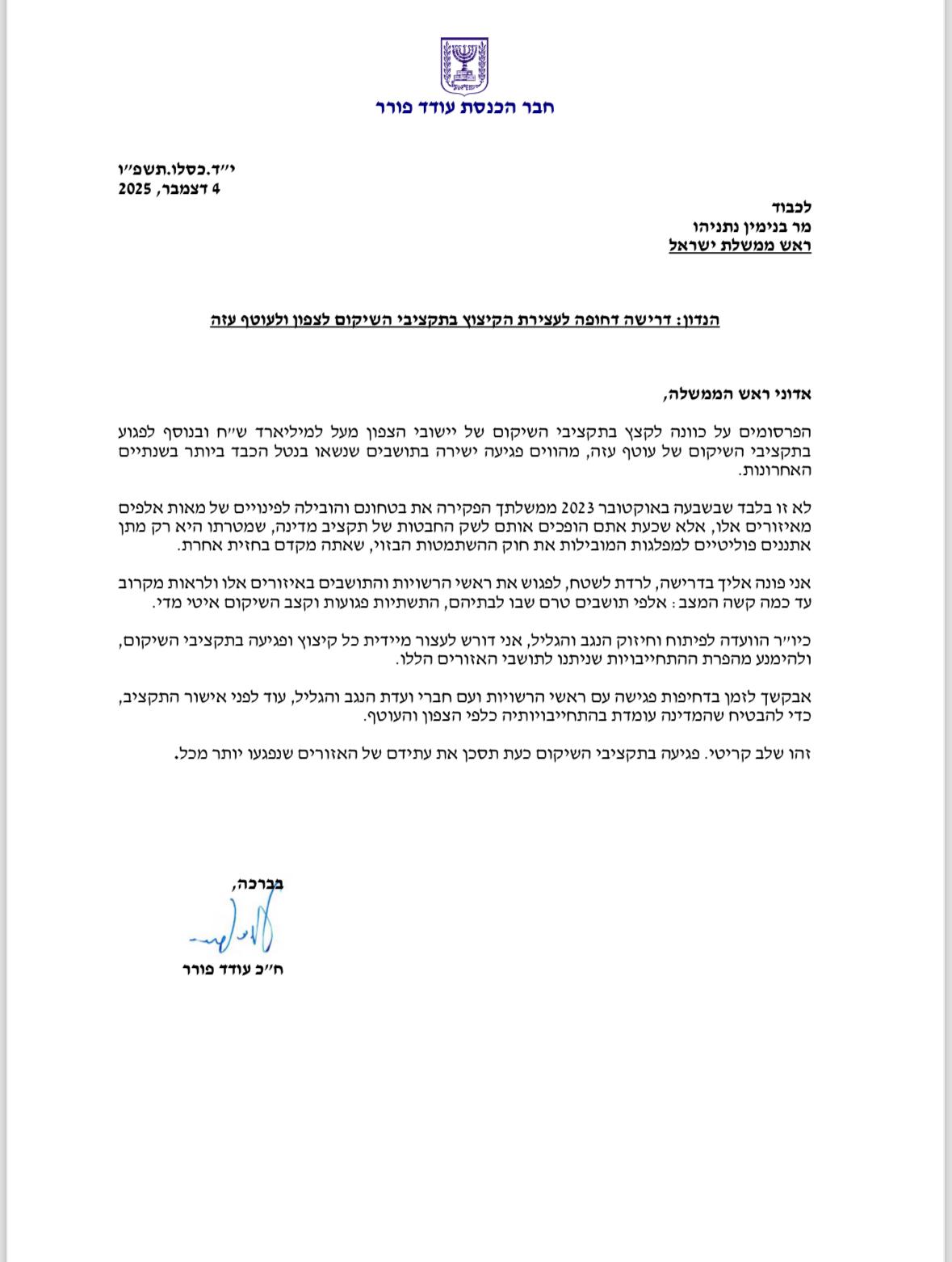 פורר מזהיר כי “הפגיעה הזאת היא לא עוד סעיף תקציבי זו שבירה של אמון בסיסי בין המדינה לאזרחיה. אם הממשלה תקדם את המהלך, היא חוצה קו אדום ומסכנת את עתיד האזורים שנפגעו יותר מכל.” ״אני דורש מראש הממשלה לעצור את זה כאן ועכשיו. זה מבחן מנהיגות: או שעומדים לצד תושבי הצפון והעוטף או שממשיכים להקריב אותם על מזבח עסקאות פוליטיות.”