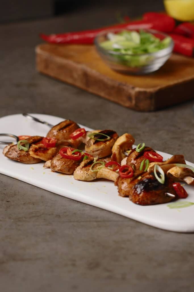מסדרים את הפטריות על שיפוד מתכת, מברישים שוב את הפטריות במרינדה במידת הצורך, וצולים על המנגל שחומם מראש עד להזהבה.