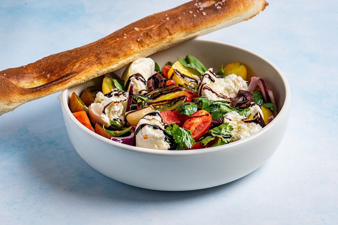 סלט פנצנלה – מיקס עגבניות, קרעי מוצרלה, שום קונפי, בצל סגול, זיתי קלמטה, רוטב בסלמי מצומצם מוגש עם פוקצי'נה. מחיר למנה: 47ש"ח