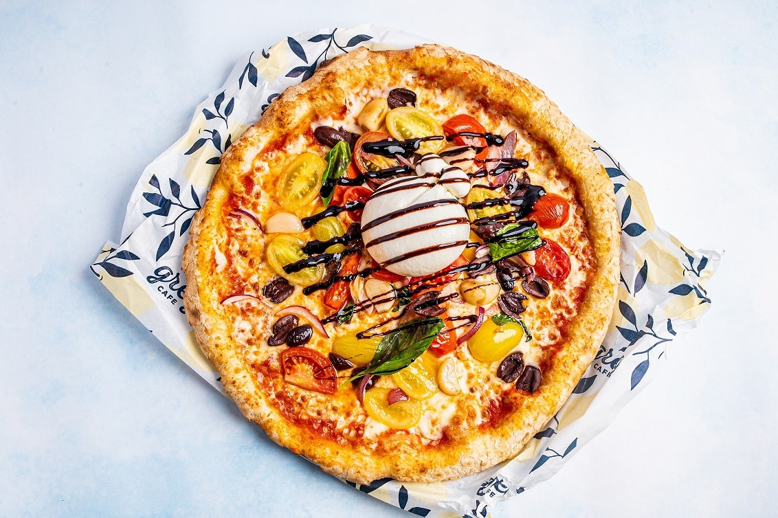 פיצה בוראטה – רוטב עגבניות קלאסי, גבינת מוצרלה, שרי, קלמטה, עלי בזיליקום, בצל סגול, שום קונפי, בוראטה ורוטב בלסמי מצומצם. מחיר למנה: 83 ₪.