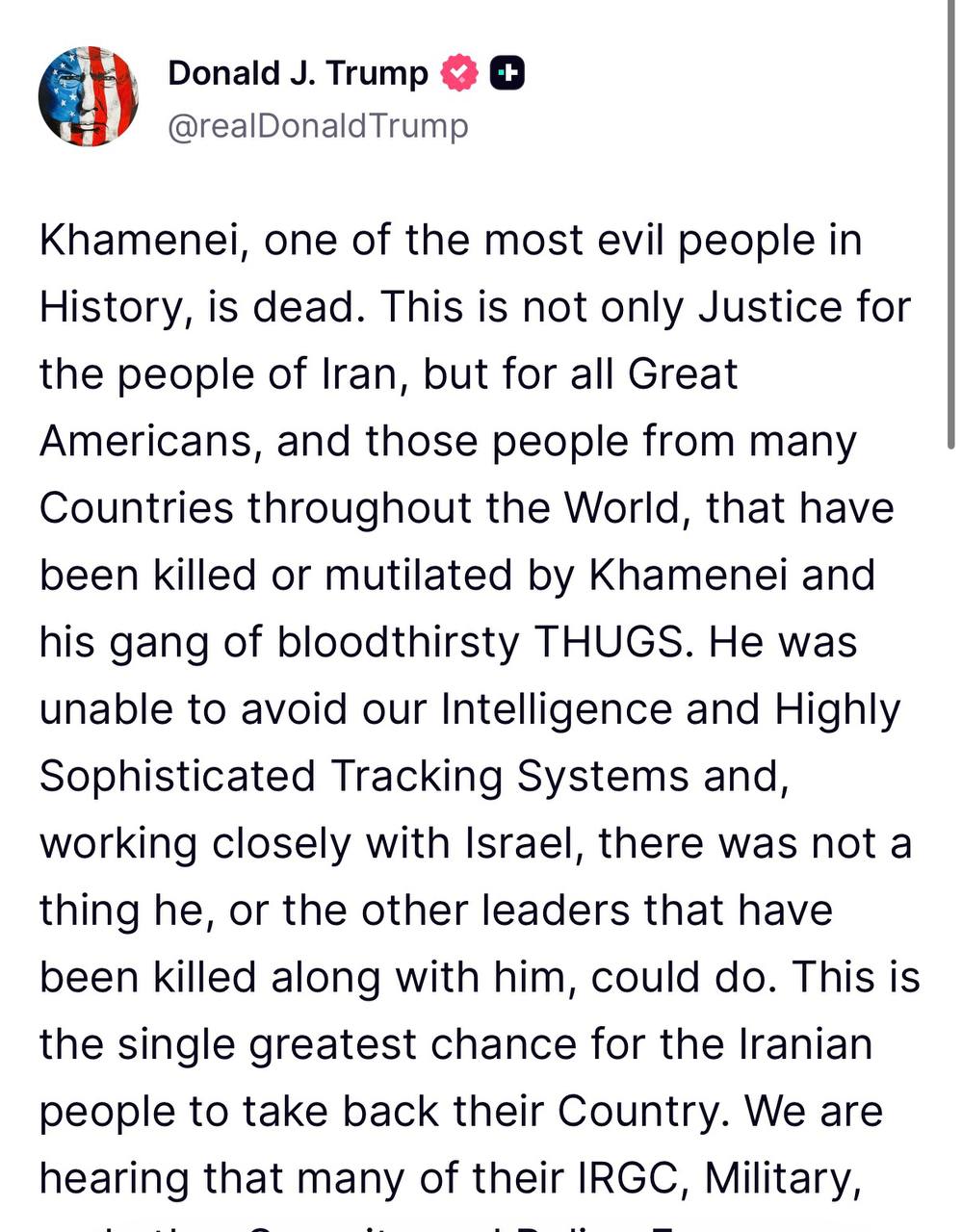 טראמפ: חמינאי, אחד האנשים הרשעים ביותר בהיסטוריה, מת. זה לא רק צדק לעם האיראני, אלא לכל האמריקאים הגדולים, ולאותם אנשים ממדינות רבות ברחבי העולם, שנהרגו או הושחתו על ידי חמינאי וכנופיית הבריונים צמאי הדם שלו. הוא לא הצליח להימנע מהמודיעין שלנו וממערכות המעקב המתוחכמות ביותר, ובעבודה צמודה עם ישראל, לא היה דבר שהוא, או המנהיגים האחרים שנהרגו יחד איתו, יכלו לעשות.
