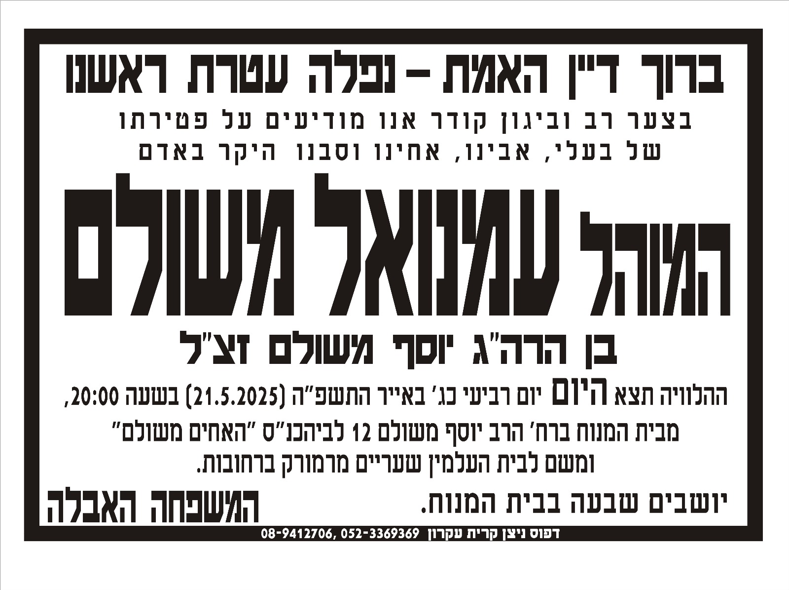 כשהוא אוחז בנימול הרך ומברך את הסנדק, לעיני קהל של מאות אנשים באולם אירועים בצומת בילו, התמוטט המוהל האהוב מרחובות, עמנואל משולם – ומת. הלוייתו תצא הערב [רביעי] בשעה 20:00 מבית המנוח ברחוב הרב יוסף משולם 12 אל בית הכנסת האחים משולם ומשם לבית העלמין שעריים מרמורק ברחובות.