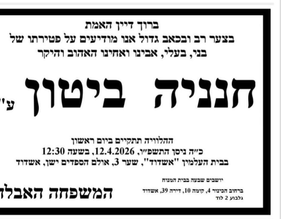 העיר לוד והקהילה באשדוד מתקשות לעכל את שרשרת האסונות הבלתי נתפסת שפקדה את משפחות זיתון ואלימלך. בעוד המשפחה יושבת שבעה על מותה הטראגי של הילדה אביגיל אלימלך ז"ל, שהלכה לעולמה בשבוע שעבר, הכה גורל מר נוסף: חנניה (חנן) ביטון ז"ל, אחיה של אם המשפחה גלית, נפטר לפתע לאחר שלבו נדם.